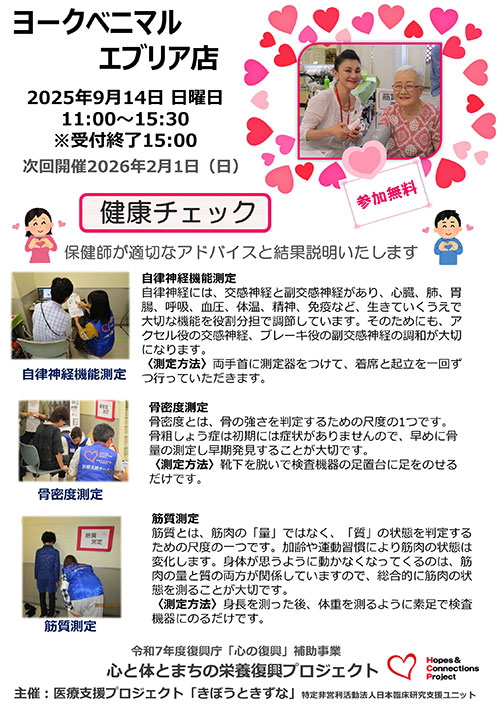 今年度の支援活動のスタートは9月14日、いわき市のヨークベニマルエブリア店からです。ヨークベニマルさんの他の店舗でも開催させて頂きますが、各店舗二回ずつの予定です。健康チェック1回目で改善のためのアドバイスをします。2回目でその後の健康状態を測定し、改善具合を知ることで励みにできたらという思いです。今年度も被災地の皆さまが健康に生きるためのプログラムを用意してお待ちしています!