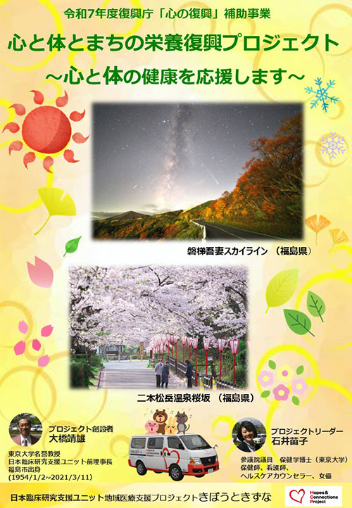 今年度の「心と体とまちの栄養復興プロジェクト」(復興庁「心の復興」補助事業)のパネルです。今年度も写真は浪江町から避難されている北中央復興公営団地自治会長さんの作品の中から福島県内の風景を選ばせていただきました。このパネルは被災地で活動を開催する際に、参加を呼び掛ける広報ツールです。ひとりでも多くの方の心に届くよう、石井とスタッフが気持ちを込めて作っています。(写真上は、秋の磐梯吾妻スカイライン、下が春の二本松岳温泉桜坂です)