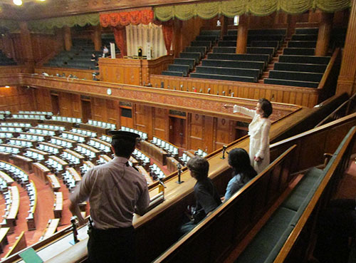 石井による国会ツアーはカナダからの学生たちのために、英語での解説となりました。まずは参議院議場からスタート。ここは3階までの吹き抜けで本会議が開かれる議場は2階にあります。正面中央には開会式の時に天皇陛下が臨席されるお席があり、その前に議長席と演壇が設けられ、議席は演壇を中心に半円形に配列されています。石井は国会議員として何度か演壇に立ち、被災地の復興支援についても質問しています。