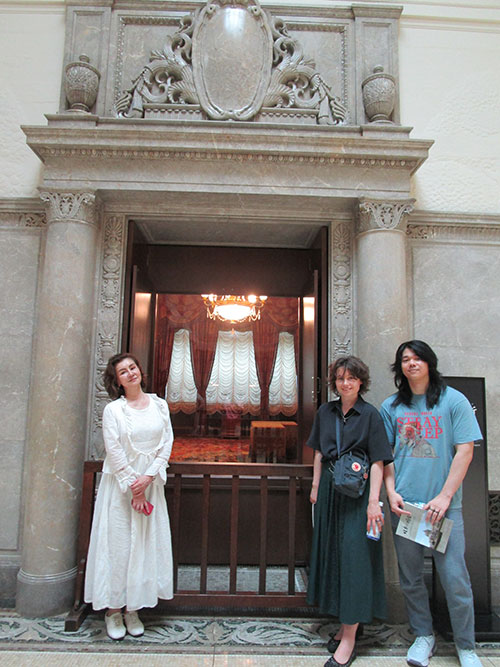 次に中央塔の真下の中央広間へ。2階から6階まで吹き抜けになっていて窓と天井にはステンドグラスがはめ込まれています。中央広間の中央階段を上がると、天皇陛下のご休憩所があり、国会の開会式当日、両院の議長と副議長とがここで天皇陛下とお目にかかります。入り口の彫刻のような門構えは一枚岩でできていて、カナダの学生たちは“なんて素晴らしい!”と声を揃え、大変気に入ってくれたようです。