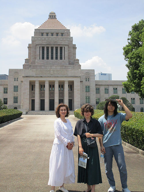 ツアー最後は、外に出て、国会議事堂を背景に記念撮影をしました。トロント在住の彼女は、カナダの国会議事堂は小高い丘の上にたち美しい建物が観光スポットになっていると教えてくれました。また国会議事堂のあるオタワは木材の街で、日本と同じく議事堂内部は主に木で作られ、余計な音を吸収する構造になっているそうです。石井はいつも見慣れた国会議事堂を前に、ふと、これからの日本やカナダ、世界のあり方についてこの二人と話してみたいと思ったのです。