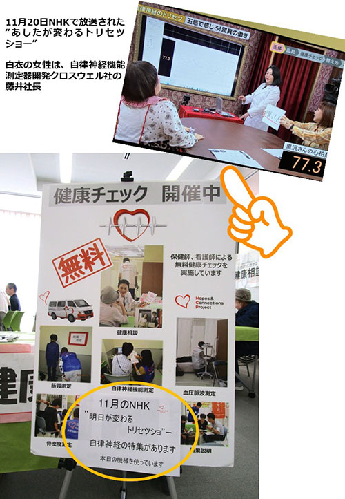 今回NHKの番組に出演されたクロスウェル社の藤井社長には多大なるご支援を頂いているきぼうときずなです。藤井社長は自律神経の機能を見える化した製品を開発し、企業や健康医療関係で役立てていらっしゃいます。