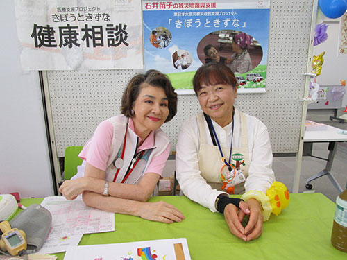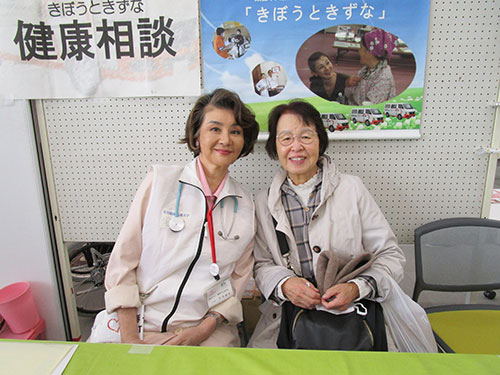 石井が先輩保健師として頼りにしている地元富岡町の月子さん。2011年石井が初めて郡山市の富岡町住民が避難していたビッグパレットに医療支援車を運転していった時から、きぼうときずなに協力していただいている同志です。石井のこの安心しきった笑顔を見て下さい!