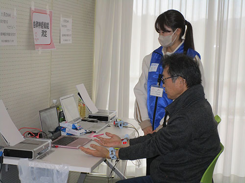 心と体の健康をみるのに欠かせない自律神経機能の測定に立会う学生ボランティア。両手首に測定器をつけて、着席と起立を1回ずつ行って測ります。