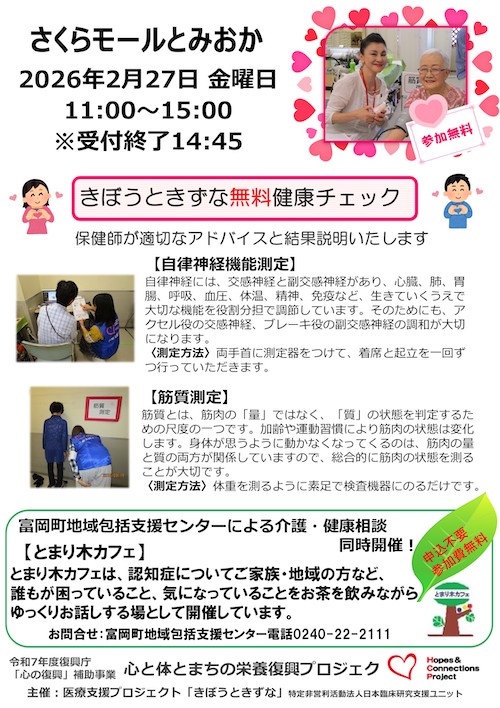 2月の末には、被災地、双葉郡富岡町のショッピングモール、さくらモールとみおかでイベントを実施するんですけどね、これは富岡町地域包括支援センターとのコラボで認知症予防についても取り組んでいきます。健康チェックの後に、認知症に関する情報提供や、心配事など相談に応じる機会をつくります