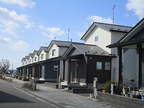 福島県伊達郡桑折町にある桑駅前団地は、東日本大震災で被災した方向けに2019年から入居が始まった災害公営住宅です。写真のように全戸一戸建て3LDKと広く、駅や学校などが徒歩圏にあり生活しやすいように作られました。復興が進むにつれて被災者の方だけでなく地域の子育て世代なども入居できるようなりました。集会所もあり、地域のコミュニティを活発化し老いも若きも長く地元で暮らしていけるよう考えて町づくりがすすめられています。
